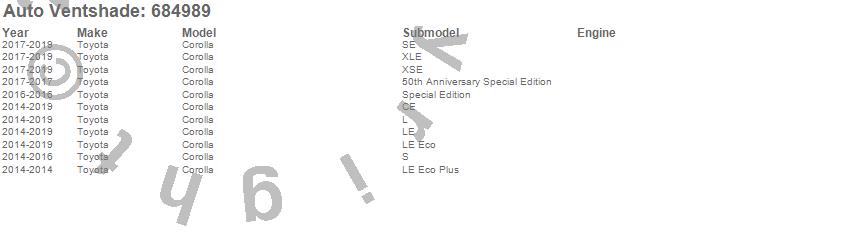 Below is an abbreviated list of applications for the Chrome Ventvisor Deflector 4 pc..Corolla, Toyota, 2019, 2018, 2017, 2016, 2015, 2014