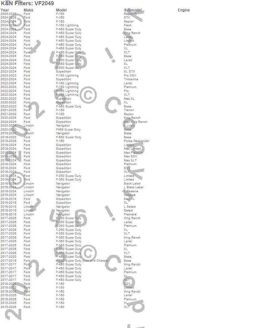 Below is an abbreviated list of applications for the Cabin Air Filter.F-150, F-250 Super Duty, F-350 Super Duty, Ford, 2018, 2017, 2016, 2015
