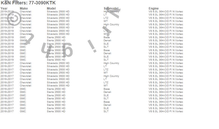 Below is an abbreviated list of applications for the 77 Series Air Intake System.Sierra 2500 HD, Sierra 3500 HD, Silverado 2500 HD, Silverado 3500 HD, Chevrolet, GMC, 2019, 2017, 2016