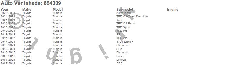 Below is an abbreviated list of applications for the Chrome Ventvisor Deflector 4 pc..Tundra, Toyota, 2021, 2020, 2019, 2018, 2017, 2016, 2015, 2014, 2013, 2012, 2011, 2010, 2009, 2008, 2007