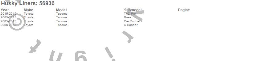 Brand: Husky LinersPart Number: 56936Mud Flap Kit Type: 4 pc. - Black - Fits Models w/Factory Fender Flares - Front And Rear - Incl. Installation KitUPC: 753933569365