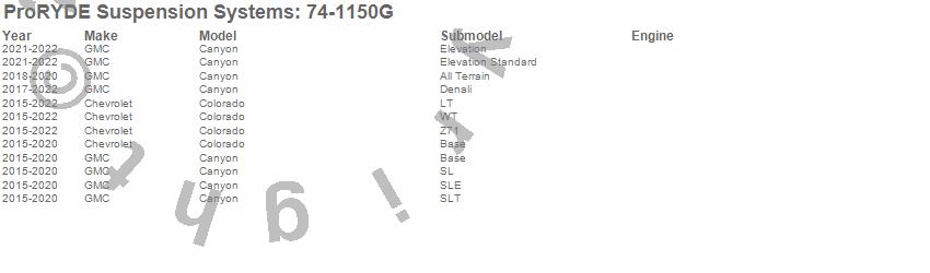 Brand: ProRYDE Suspension SystemsPart Number: 74-1150GSuspension Front Leveling Kit Type: Front - Adjustable - 1.5-2.25 in. Lift - 2.1 Hours Install Time - On Vehicle AdjustmentUPC: 029476741156