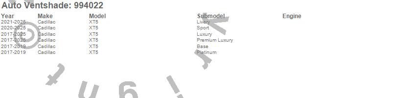 Below is an abbreviated list of applications for the Ventvisor Low Profile Deflector 4 pc..XT5, Cadillac, 2025, 2024, 2023, 2022, 2021, 2020, 2019, 2018, 2017