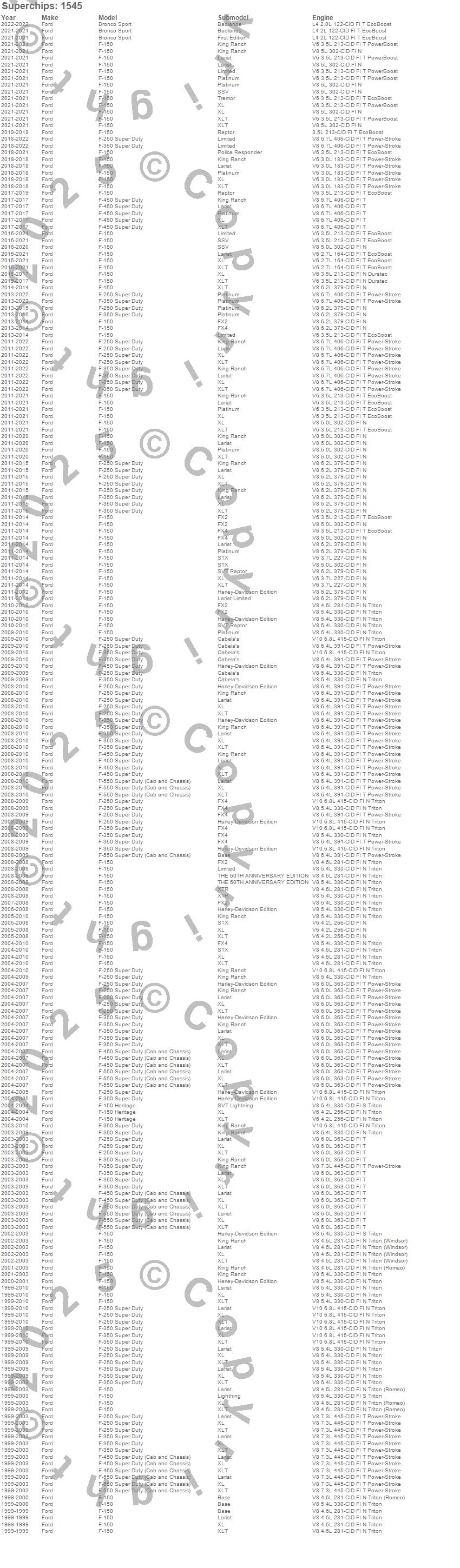 Below is an abbreviated list of applications for the Flashcal For Truck Programmer.F-150, F-150 Heritage, F-250 Super Duty, F-350 Super Duty, F-450 Super Duty, F-550 Super Duty, Ford, 2018, 2017, 2016, 2015, 2014, 2013, 2012, 2011, 2010, 2009, 2008, 2007, 2006