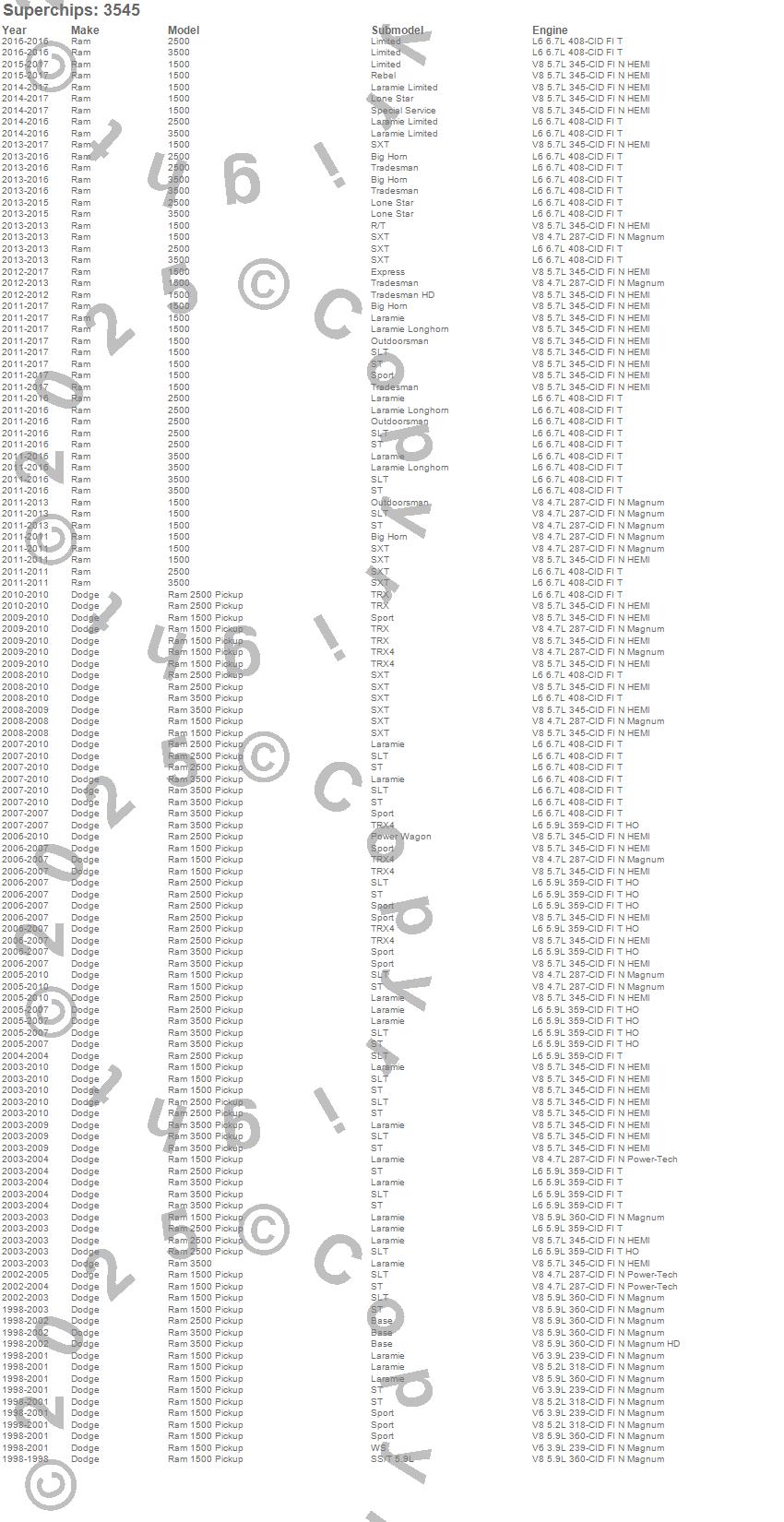 Below is an abbreviated list of applications for the Flashcal For Truck Programmer.1500, 2500, 3500, Ram 1500, Ram 2500, Ram 3500, Dodge, Ram, 2016, 2015, 2014, 2013, 2012, 2011, 2010, 2009, 2008, 2007, 2006, 2005