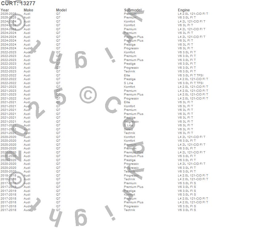 Below is an abbreviated list of applications for the Class III 2 in. Receiver Hitch.Q7, Audi, 2025, 2024, 2023, 2022, 2021, 2020, 2019, 2018, 2017