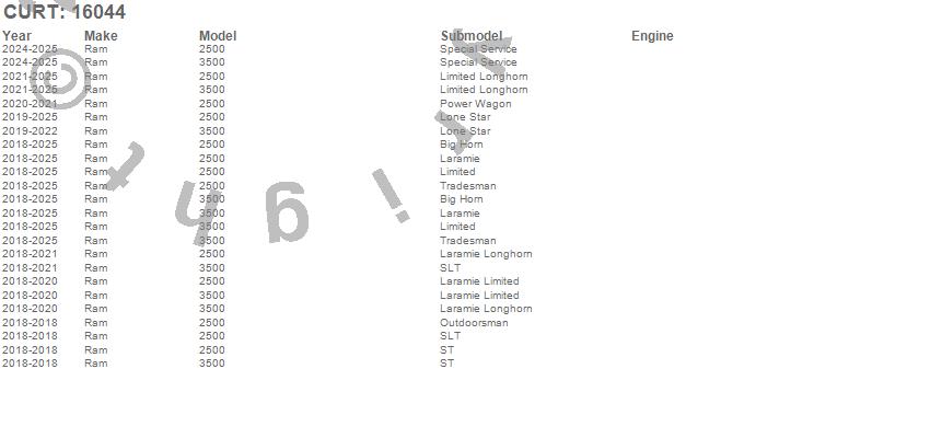 Brand: CURTPart Number: 16044Fifth Wheel Trailer Hitch Type: 20000 lbs. Capacity - 5000 lbs. Vertical Load - w/Ram Puck System LegsUPC: 612314160440