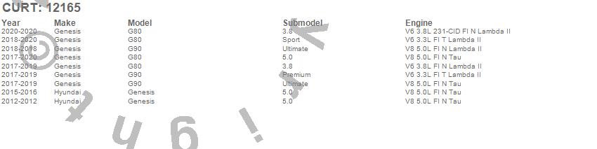 Below is an abbreviated list of applications for the Class II 1.25 in. Receiver Hitch.G80, G90, Genesis, Genesis, Hyundai, 2020, 2019, 2018, 2017, 2016, 2015, 2012