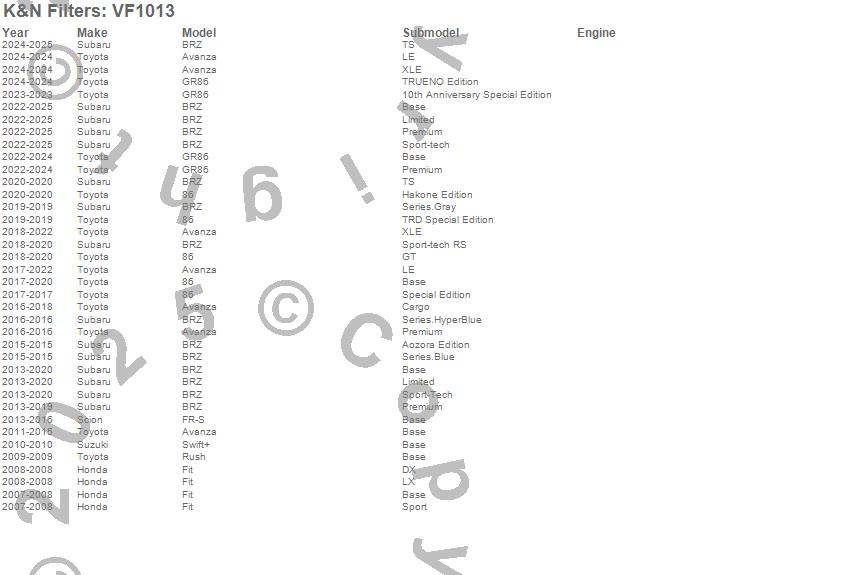 Below is an abbreviated list of applications for the Cabin Air Filter.86, BRZ, Fit, FR-S, Swift+, Honda, Scion, Subaru, Suzuki, Toyota, 2019, 2018, 2017, 2016, 2015, 2014, 2013, 2010, 2008, 2007