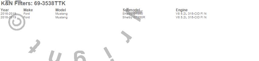 Brand: K&N FiltersPart Number: 69-3538TTKAir Intake Kit Type: Incl. Air Filter/Heat Shield/Textured Black Tubing - Estimated Horsepower Gain 18.12 HP At 6400 RPMUPC: 024844364029
