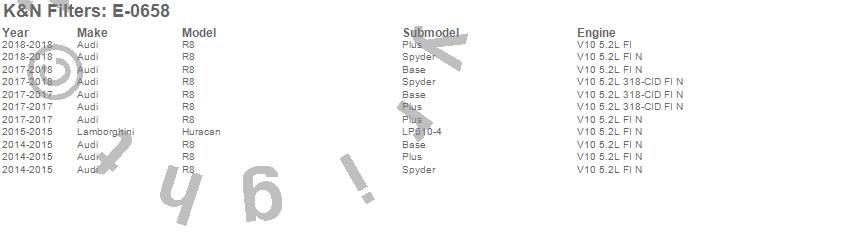 Below is an abbreviated list of applications for the Air Filter.Huracan, R8, Audi, Lamborghini, 2018, 2017, 2015, 2014