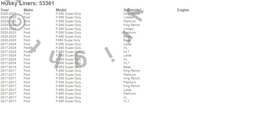 Below is an abbreviated list of applications for the X-act Contour Floor Liner.F-250 Super Duty, F-350 Super Duty, F-450 Super Duty, F450 Super Duty, Ford, 2026, 2024, 2023, 2022, 2021, 2020, 2019, 2018, 2017