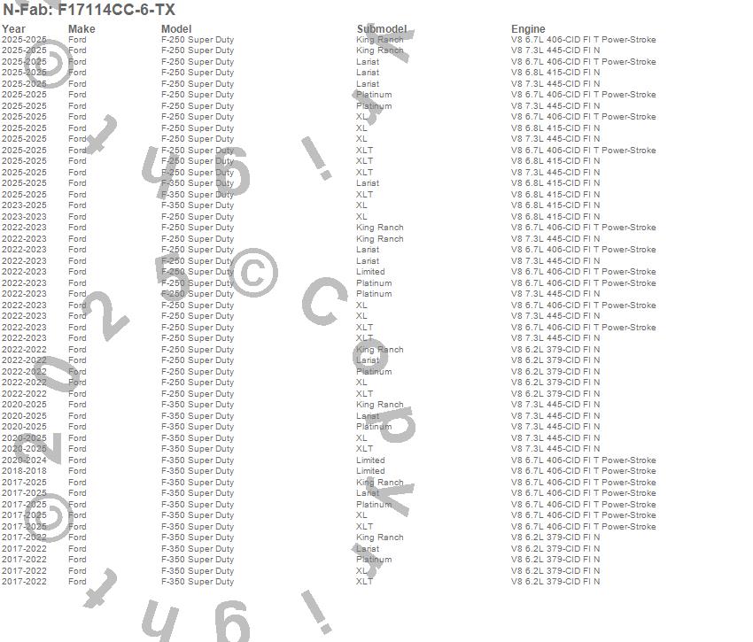 Below is an abbreviated list of applications for the Wheel To Wheel Nerf Step Bar w/Bed Access.F-250 Super Duty, F-350 Super Duty, Ford, 2026, 2025, 2024, 2023, 2022, 2021, 2020, 2019, 2018, 2017