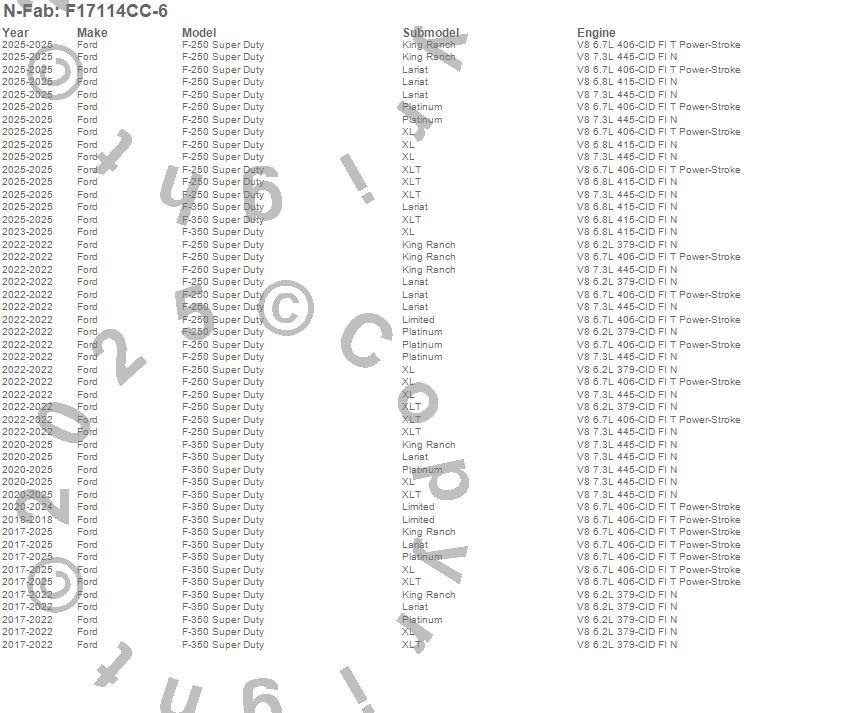 Below is an abbreviated list of applications for the Wheel To Wheel Nerf Step Bar w/Bed Access.F-250 Super Duty, F-350 Super Duty, Ford, 2026, 2025, 2024, 2023, 2022, 2021, 2020, 2019, 2018, 2017