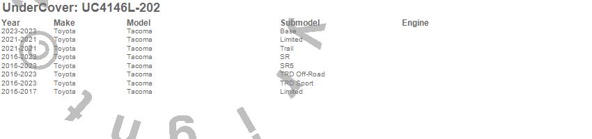 Brand: UnderCoverPart Number: UC4146L-202Tonneau Cover Type: Black - Paint Code 202 - w/Multi-Track HardwareUPC: 815138028686