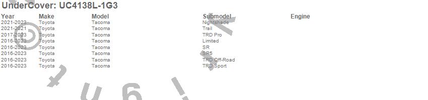 Brand: UnderCoverPart Number: UC4138L-1G3Tonneau Cover Type: Charcoal - Paint Code 1G3UPC: 816391021674