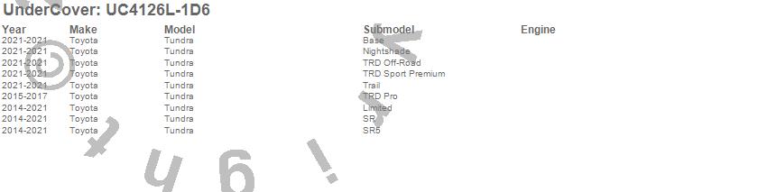 Below is an abbreviated list of applications for the LUX Tonneau Cover.Tundra, Toyota, 2021, 2020, 2019, 2018, 2017, 2016, 2015, 2014