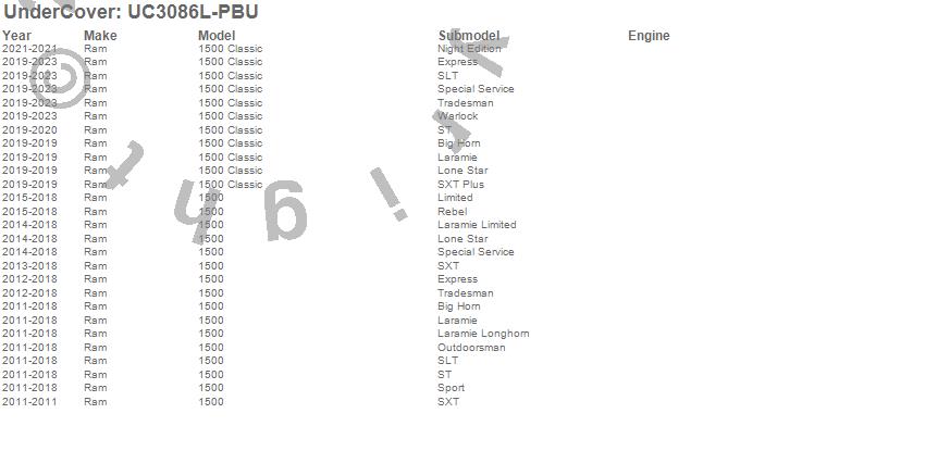 Brand: UnderCoverPart Number: UC3086L-PBUTonneau Cover Type: True Blue - Paint Code PBU - Will Not Fit Ram BoxUPC: 897197008922