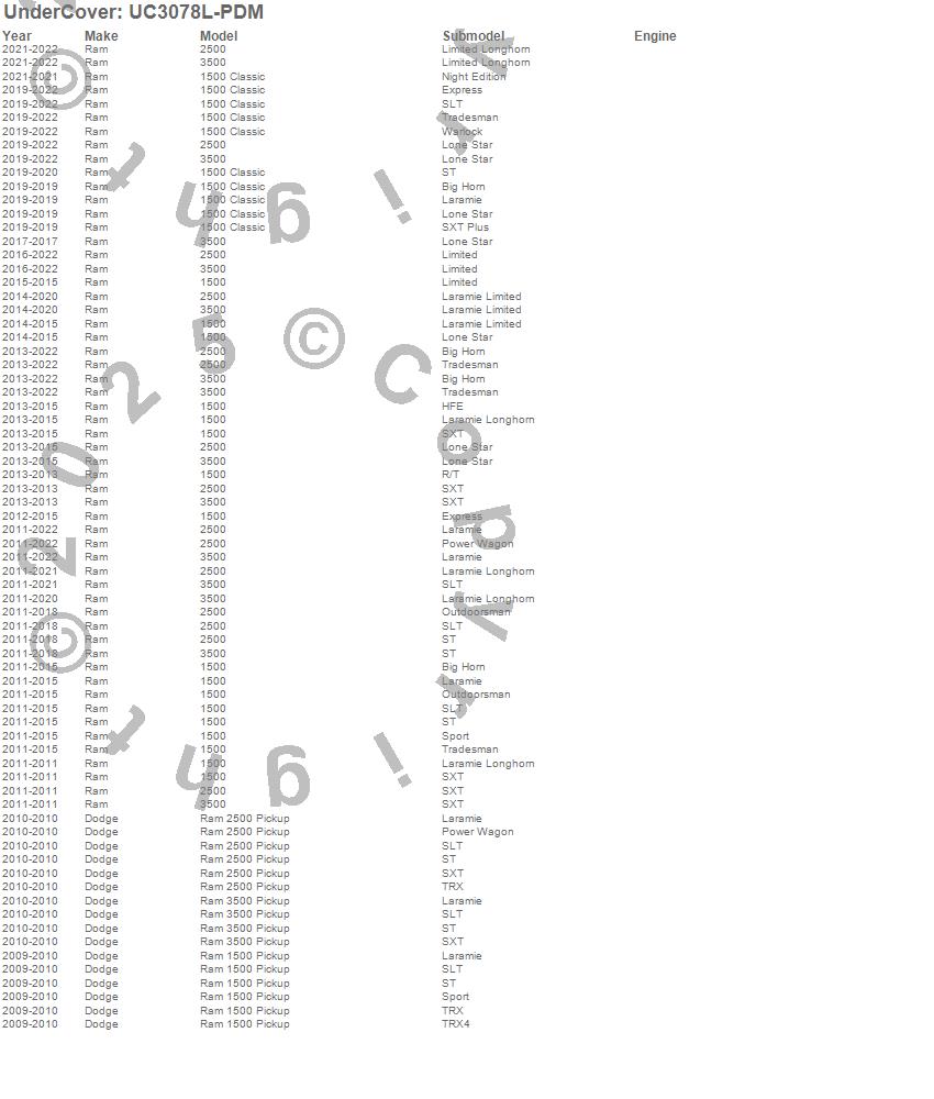 Brand: UnderCoverPart Number: UC3078L-PDMTonneau Cover Type: Mineral Gray - Paint Code PDM - Will Not Fit Ram BoxUPC: 816391021544