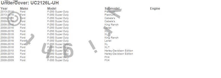 Below is an abbreviated list of applications for the LUX Tonneau Cover.F-250 Super Duty, F-350 Super Duty, Ford, 2016, 2015, 2014, 2013, 2012, 2011, 2010, 2009, 2008