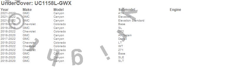 Brand: UnderCoverPart Number: UC1158L-GWXTonneau Cover Type: Brownstone - Paint Code GWX/WA105VUPC: 815138028471