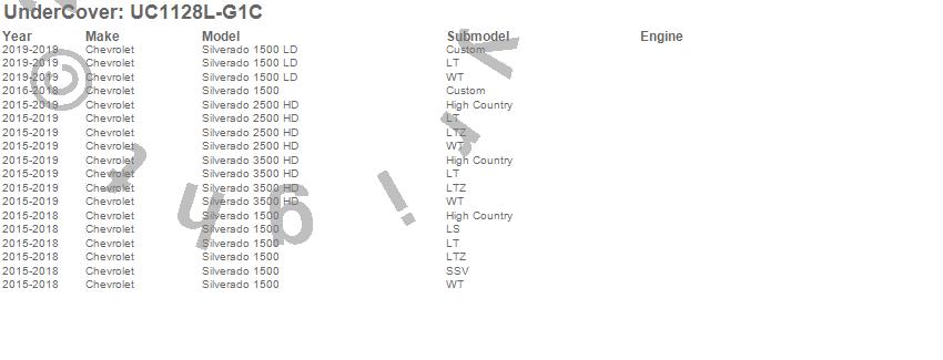 Brand: UnderCoverPart Number: UC1128L-G1CTonneau Cover Type: Overcast Effect - Paint Code G1C/WA402UPC: 816391021162