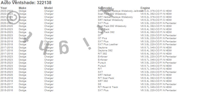 Below is an abbreviated list of applications for the Aeroskin Smoke Hood Protector.Charger, Dodge, 2023, 2022, 2021, 2020, 2019, 2018, 2017, 2016, 2015