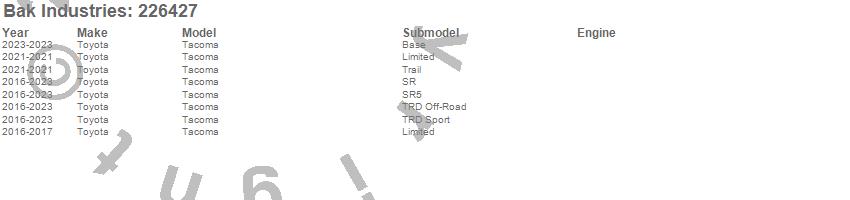 Brand: BAK IndustriesPart Number: 226427Tonneau Cover Type: Black - Aluminum - Gloss Black FinishUPC: 819275040501
