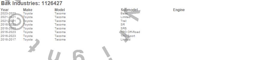 Brand: BAK IndustriesPart Number: 1126427Tonneau Cover Type: Black - Fiberglass Covered Aluminum - Textured Black FinishUPC: 819275039383