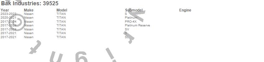 Brand: BAK IndustriesPart Number: 39525Tonneau Cover Type: Black - Vinyl Top w/ Aluminum Underside - Leather Grain FinishUPC: 819275027151