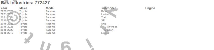 Brand: BAK IndustriesPart Number: 772427Tonneau Cover Type: Black - Fiberglass Covered Aluminum - Textured Black FinishUPC: 819275038287
