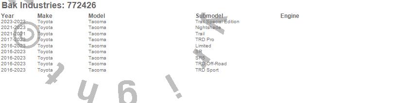 Brand: BAK IndustriesPart Number: 772426Tonneau Cover Type: Black - Fiberglass Covered Aluminum - Textured Black FinishUPC: 819275038270