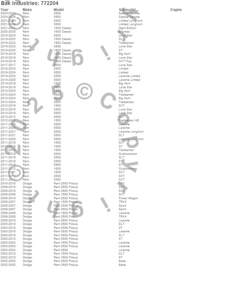 Below is an abbreviated list of applications for the BAKFlip F1 Hard Folding Truck Bed Cover.1500, 1500 Classic, 2500, 3500, Ram 1500, Ram 2500, Ram 3500, Dodge, Ram, 2024, 2023, 2022, 2021, 2020, 2019, 2018, 2017, 2016, 2015, 2014