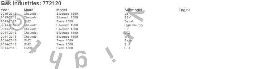 Brand: BAK IndustriesPart Number: 772120Tonneau Cover Type: Black - Fiberglass Covered Aluminum - Textured Black FinishUPC: 819275037655