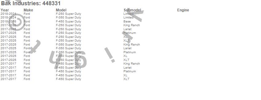 Brand: BAK IndustriesPart Number: 448331Tonneau Cover Type: Black - Aluminum - Matte FinishUPC: 819275042390