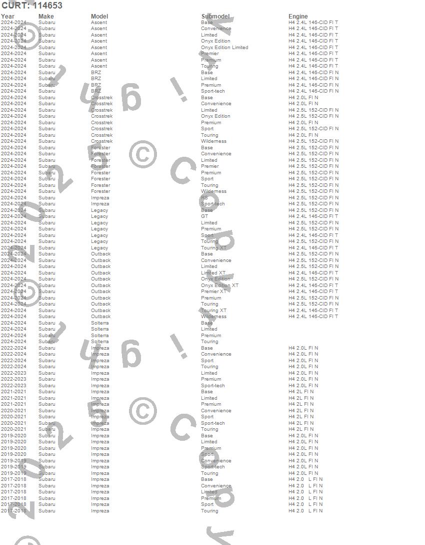 Below is an abbreviated list of applications for the Class I 1.25 in. Receiver Hitch.Impreza, Subaru, 2023, 2022, 2021, 2020, 2019, 2018, 2017