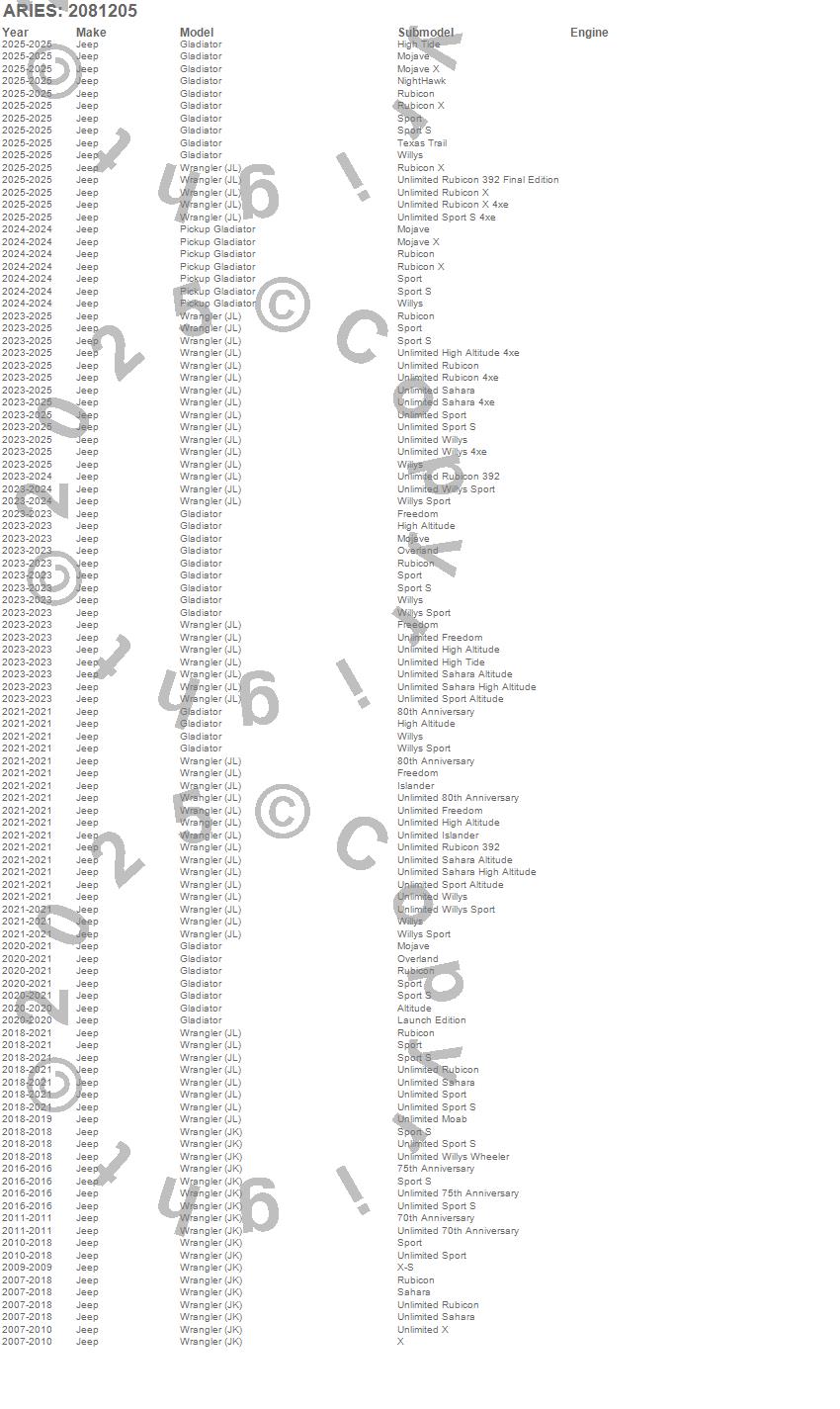 Below is an abbreviated list of applications for the TrailChaser Front Bumper Corners.Gladiator, Pickup Gladiator, Wrangler (JK), Wrangler (JL), Jeep, 2025, 2024, 2023, 2021, 2020, 2019, 2018, 2017, 2016, 2015, 2014, 2013, 2012, 2011, 2010