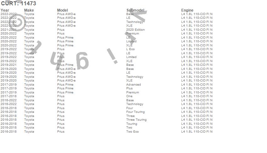 Below is an abbreviated list of applications for the Class I 1.25 in. Receiver Hitch.Prius, Prius AWD-e, Prius Prime, Toyota, 2022, 2021, 2020, 2019, 2018, 2017, 2016