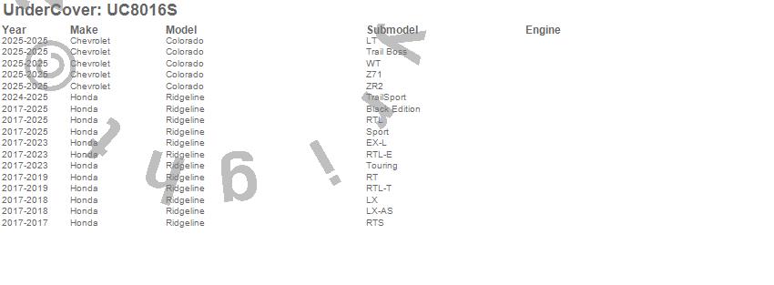 Brand: UnderCoverPart Number: UC8016STonneau Cover Type: Smooth Gray Finish - Must Be PaintedUPC: 816391022121