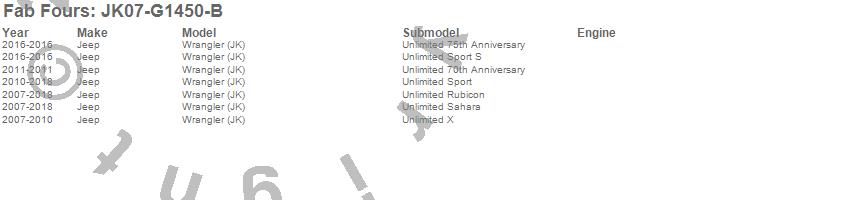Brand: Fab FoursPart Number: JK07-G1450-BRocker Panel Guard Type: Uncoated/Paintable - [AWSL]UPC: 005810114213