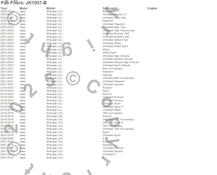 Below is an abbreviated list of applications for the Fender Flare.Wrangler (JK), Wrangler (JL), Jeep, 2024, 2023, 2022, 2021, 2020, 2019, 2018, 2017, 2016, 2015, 2014, 2013, 2012, 2011, 2010, 2009, 2008