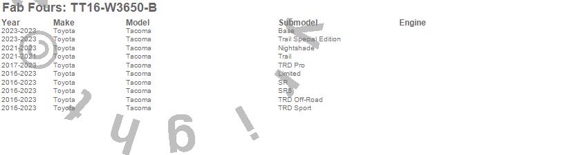 Below is an abbreviated list of applications for the Premium Rear Bumper.Tacoma, Toyota, 2023, 2022, 2021, 2020, 2019, 2018, 2017, 2016