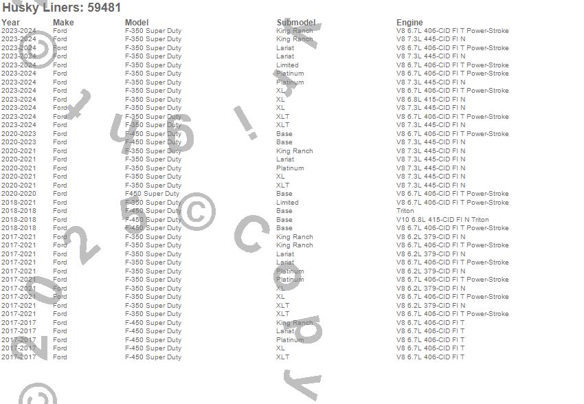 Below is an abbreviated list of applications for the Custom Molded Mud Guards.F-350 Super Duty, F-450 Super Duty, F450 Super Duty, Ford, 2024, 2023, 2022, 2021, 2020, 2019, 2018, 2017