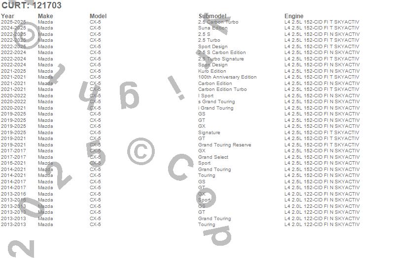 Below is an abbreviated list of applications for the Class II 1.25 in. Receiver Hitch.CX-5, Mazda, 2025, 2024, 2023, 2022, 2021, 2020, 2019, 2018, 2017, 2016, 2015, 2014, 2013
