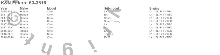 Below is an abbreviated list of applications for the 63 Series Aircharger Kit.Civic, Honda, 2019, 2018, 2017, 2016