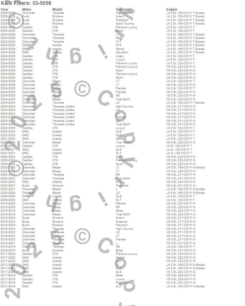 Below is an abbreviated list of applications for the Air Filter.Acadia, Blazer, Enclave, Traverse, XT5, Buick, Cadillac, Chevrolet, GMC, 2020, 2019, 2018, 2017
