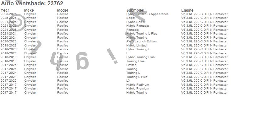 Below is an abbreviated list of applications for the Bugflector Stone/Bug Deflector.Pacifica, Chrysler, 2026, 2025, 2024, 2023, 2022, 2021, 2020, 2019, 2018, 2017