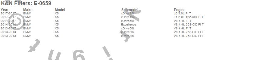Below is an abbreviated list of applications for the Air Filter.X5, X6, BMW, 2017, 2016, 2015, 2014, 2013