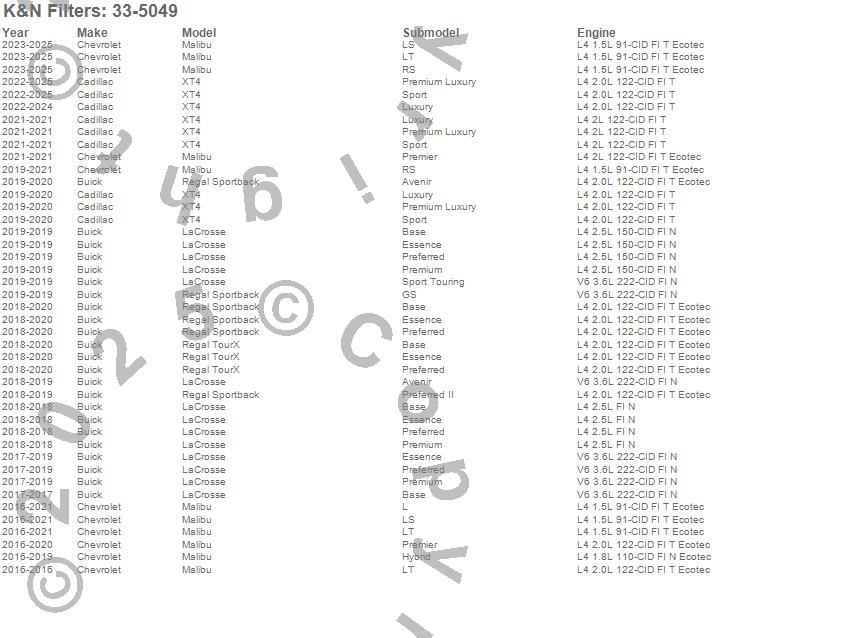 Below is an abbreviated list of applications for the Air Filter.LaCrosse, Malibu, Regal Sportback, Regal TourX, XT4, Buick, Cadillac, Chevrolet, 2020, 2019, 2018, 2017, 2016