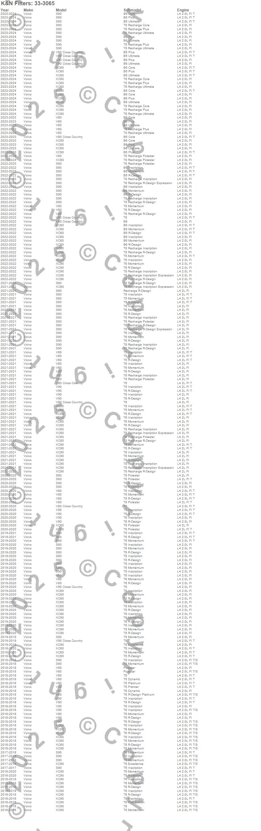 Below is an abbreviated list of applications for the Air Filter.S90, V60, V90, V90 Cross Country, XC60, XC90, Volvo, 2019, 2018, 2017, 2016